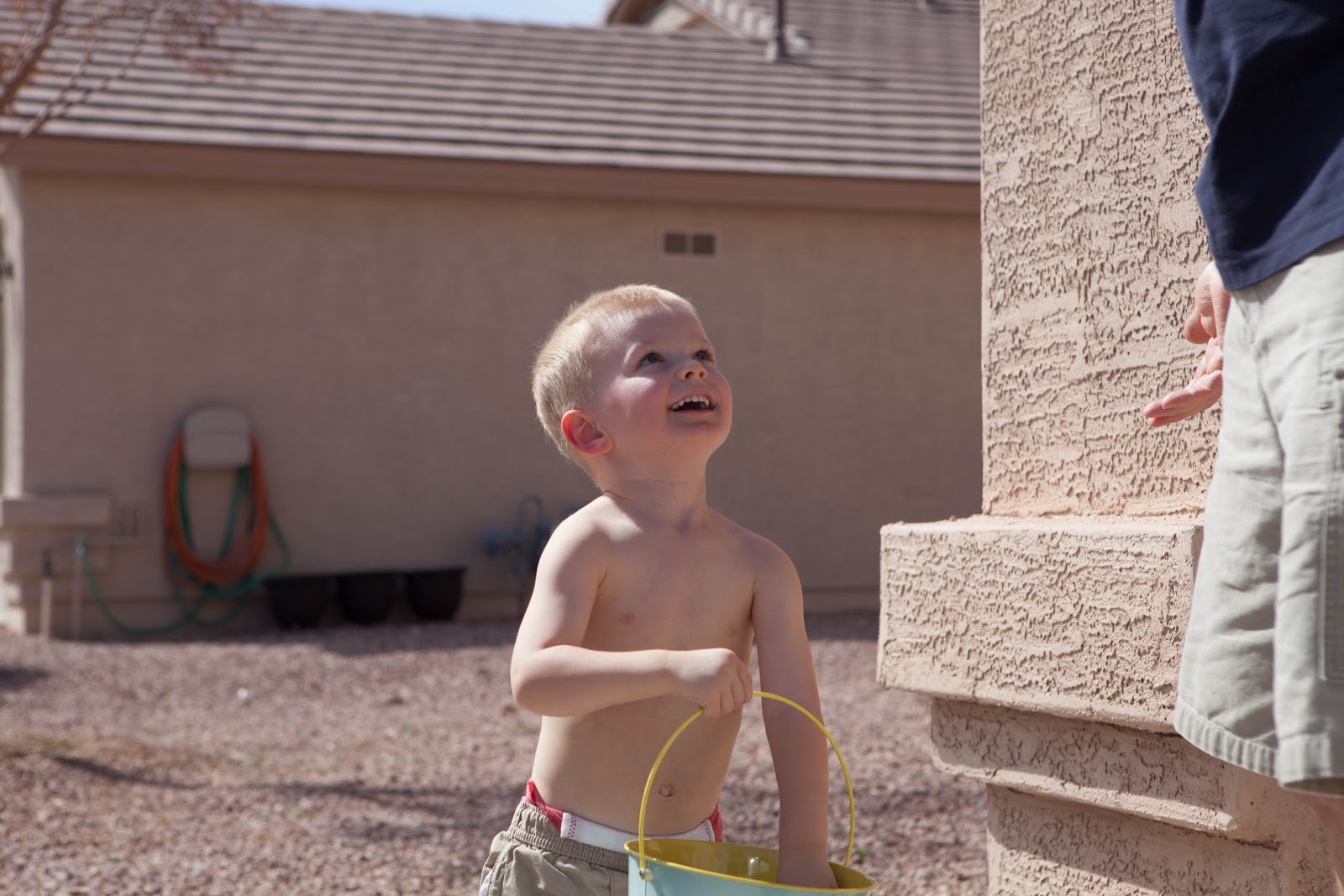 There was one golden egg hidden in this bush. So daddy had to help Ethan get it.