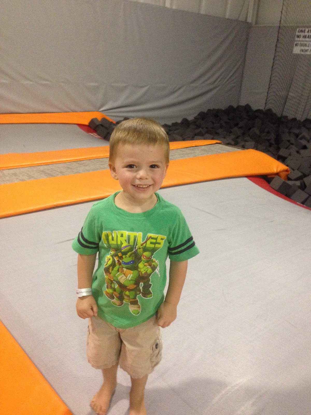 Towards the end of our hour at I-jump you could tell Wyatt was getting tired. He would jump into these sponge squares an then lay there and say he needed help getting out! haha