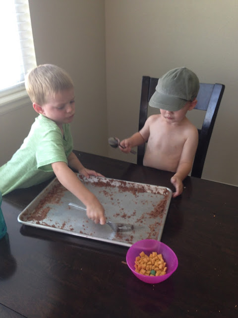 I made brownies to give to people and Ethan decided he was going to scrape off the extra that was left on the pan and eat it.