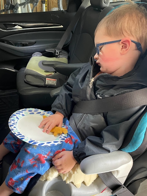 This kid wont take naps anymore. Yet if he is super tired he will fall asleep in the car. He was so tired he didn't even finish his nuggets.