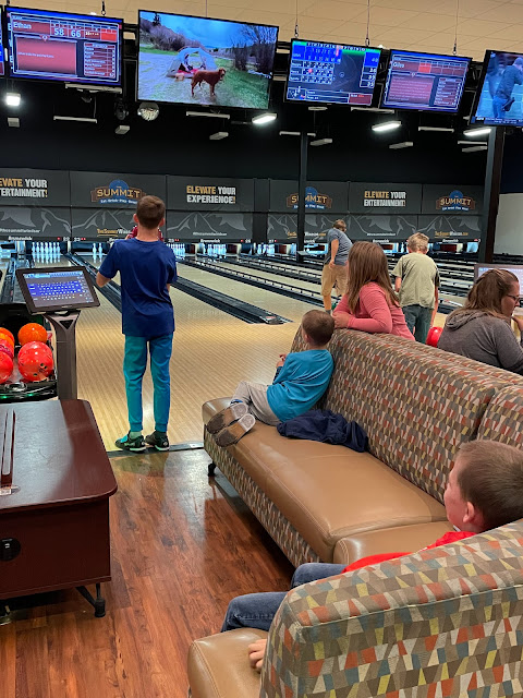 For Ethan's one on one I took him bowling. He has been loving bowling these days because of the time he got a 181 score. So I let Wyatt watch the younger kids and took Ethan out bowling.